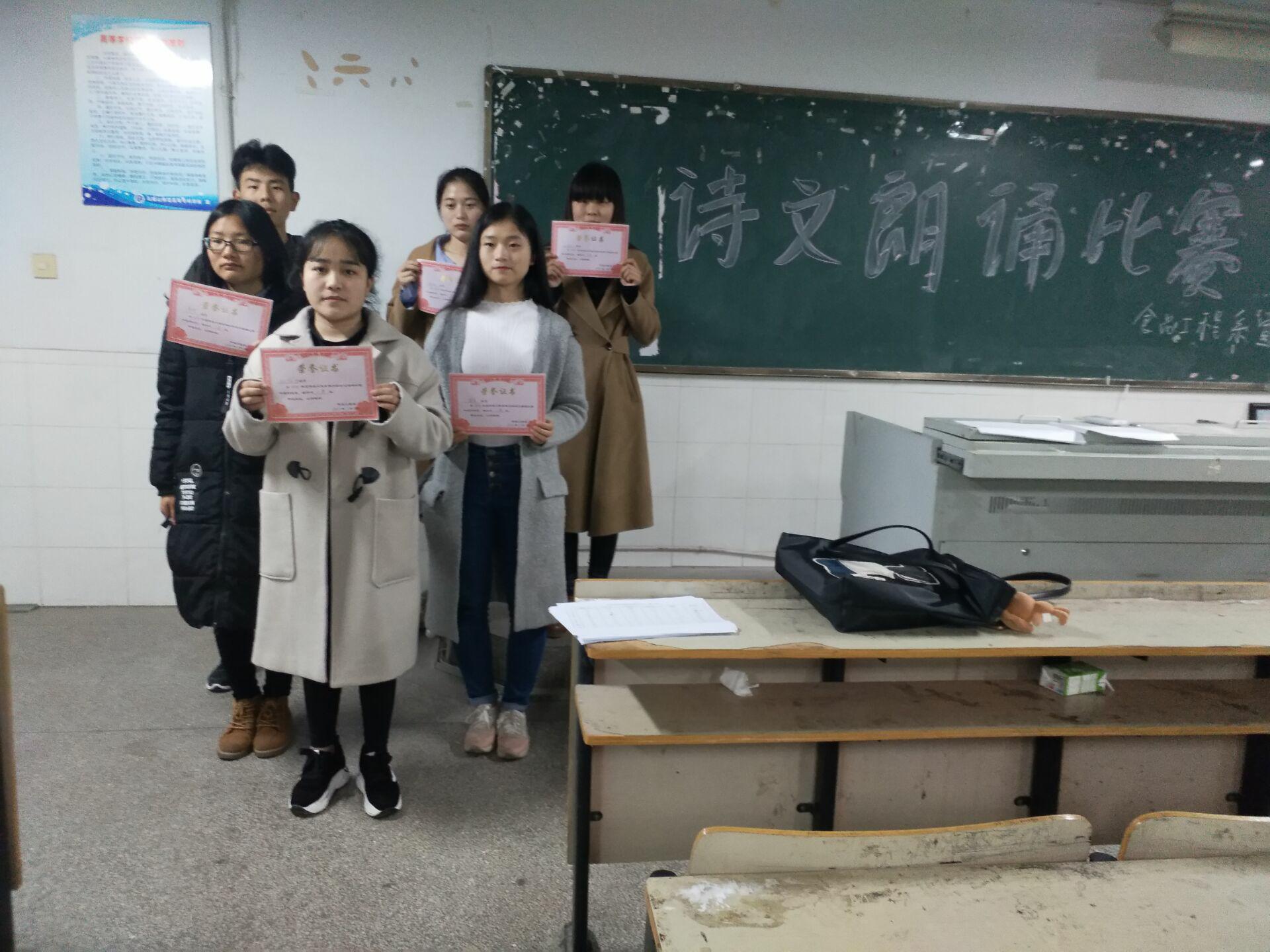 大赛宣传阶段由语工部负责人联系食品各班班委,每班选拔出至少两名选手参加比赛。3月18日18:00在主持人介绍完到场评委及比赛规则后,大赛正式开始。大赛中第一环节是自我介绍,选手们使出浑身解数,在三分钟的时间向评委展示饱满的激情和热情。评委会选出前十名同学进行第二环节;第二环节是经典诵读,起源诗、边塞诗、山水诗、歌咏爱情、抒发爱国情感的一首首熟悉的诗词铺展在观众面前,在带领观众领略古代经典诗歌博大恢弘魅力,叹服先哲先进创作思想的同时,每一位观众心灵都受到深深地濡染与洗礼。在工作人员紧张统分期间,各评委对选手们的精彩表现做了点评,并在诗歌朗诵技巧上、现场气氛掌控上提出了改进意见。最后,食品加工(2)班孙洒洒凭借着卓越的朗诵技巧赢得了评委一致的认可最终获得一等奖;食品检测(1)班的崔年、李雪凭借实力也获得了二等奖的好成绩;营养与卫生(1)班的孙会会,食品加工(2)班的汪恒,食品检测(2)班的侯田田获得三等奖。