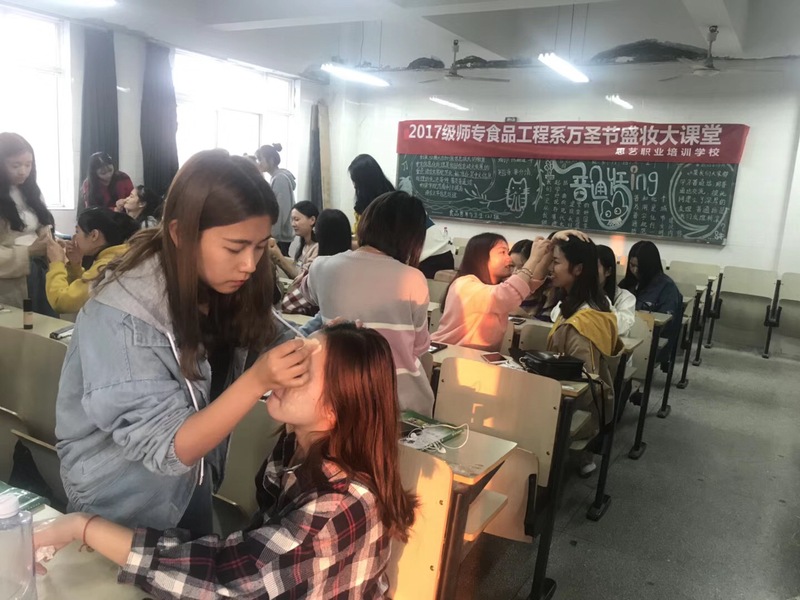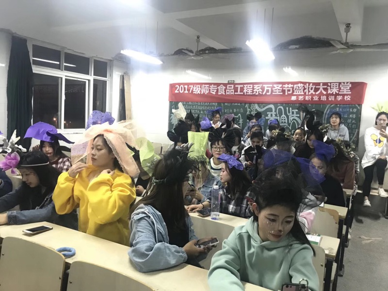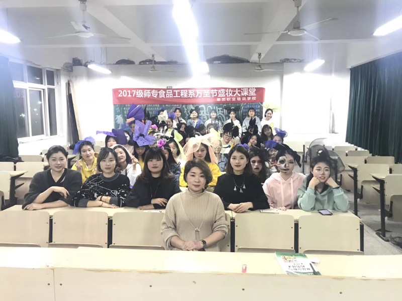 本网讯 为了让课堂学习生活更加丰富多彩,增强同学们的学习兴趣,恰逢万圣节前夜的到来,职业形象设计课程老师纪娟带领食品专业学生开展了以万圣节为主题的盛装大课堂活动。