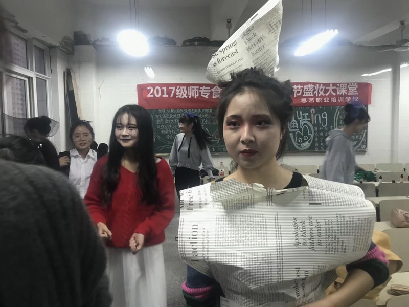 在课堂上,老师带来了充足齐全的化妆材料,组织着同学们用身边常见的物品制作着与万圣节相关的饰品,例如废旧报纸制作的衣服,剩余的蛇皮口袋、塑料花制作的头饰,再配上夸张的妆容,一个个活灵活现的鬼怪就这样诞生了。在整个活动中,同学们都带着开心的笑容,为彼此设计着各种各样的造型,对于老师偶尔的提问也给予热情的回应,万圣节前夜因食品学子的欢声笑语变得温暖有趣起来。